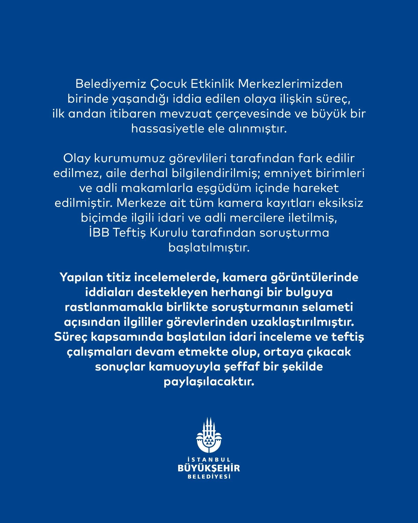 “Belediyemiz Çocuk Etkinlik Merkezlerimizden birinde yaşandığı iddia edilen olaya ilişkin süreç, ilk andan itibaren mevzuat çerçevesinde ve büyük bir hassasiyetle ele alınmıştır.