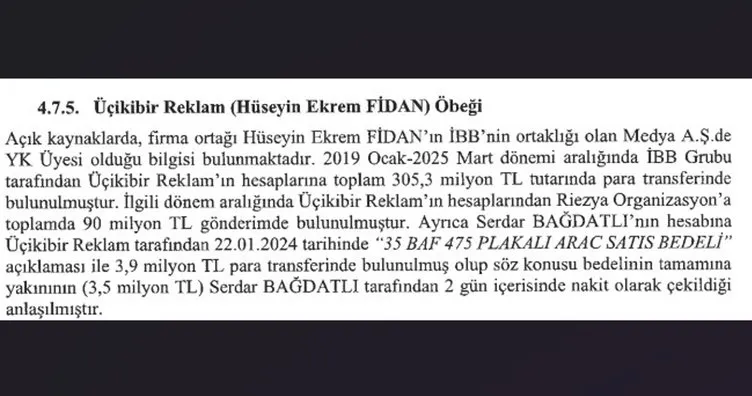 İstanbul Cumhuriyet Başsavcılığı’nın talimatıyla hazırlanan BDDK raporunda, soruşturmada adı geçen şüphelilerin banka hesap hareketleri mercek altına alındı. Rapora göre, Hüseyin Ekrem Fidan’ın sahibi olduğu Üçikibir Reklam Şirketi’ne 2019-2025 yılları arasında İBB Grubu tarafından toplam 305,3 milyon TL para transferi gerçekleştirildi.