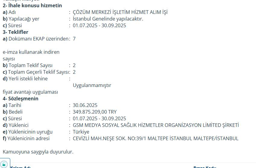4 Temmuz 2025’te GSM Medya Sosyal Sağlık Hizmetleri ile 375 milyon 504 bin TL’lik sözleşme imzalandı.