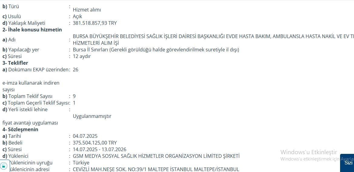 Davet edilen tek şirket olan GSM Medya Sağlık Hizmetleri ile 27 Mart 2025’te 614 milyon 408 bin TL’lik sözleşme yapıldı.