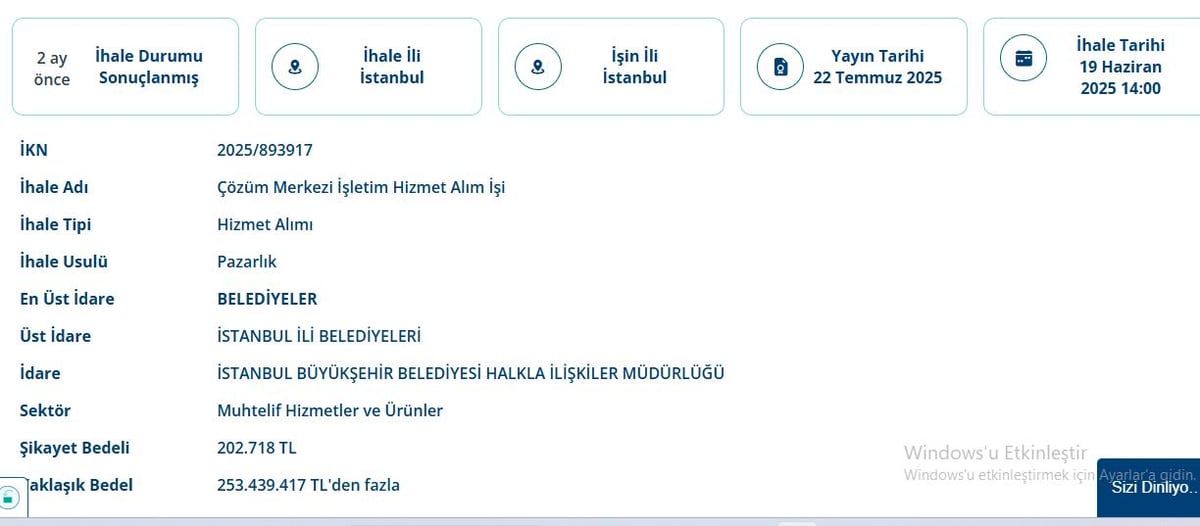 İBB Halkla İlişkiler Müdürlüğü, 19 Haziran 2025’te “Çözüm Merkezi İşletim Hizmetleri” başlıklı bir ihale gerçekleştirdi.