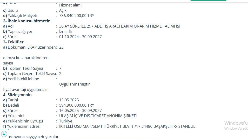 Şirketin aldığı en yüksek bedelli iş ise Aralık 2024’te başlayan ve Kasım 2026’ya kadar sürecek olan 4 milyar 906 milyon TL’lik bakım sözleşmesi oldu.