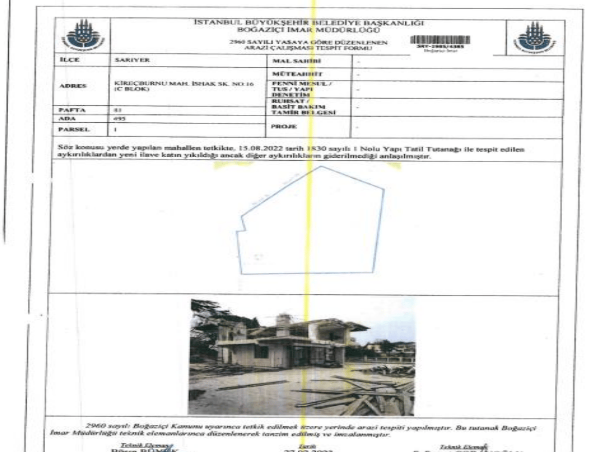 - Boğaziçi İmar Müdürlüğü Evrakları: Dosyaya giren 15 Ağustos 2022 tarihli Yapı Tatil Tutanağı'nda, "İskanlı ana yapının bordum katına 297,00 m2 ilave alan... çatısının kaldırılarak 122,66 m2’lik yeni kat ilave edildiği" tespit edildi. Başka bir "Arazi Çalışması Tespit Formu"nda ise "yeni ilave katın yıkıldığı ancak diğer aykırılıkların giderilmediği" belirtilerek, Öner'in "göstermelik yıkım" iddiası desteklendi.
