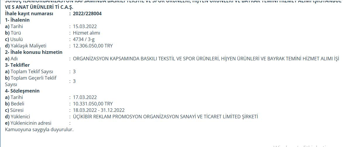 Fidan’ın şirketi ilk milyonluk ihalesini ise 15 Mart 2022 tarihinde aldı. Kültür AŞ’nin ‘Organizasyon kapsamında baskılı tekstil ve spor ürünleri, hijyen ürünleri ve bayrak temini hizmet alımı işi’ ihalesinin sözleşme bedeli 10 milyon 331 bin TL oldu.