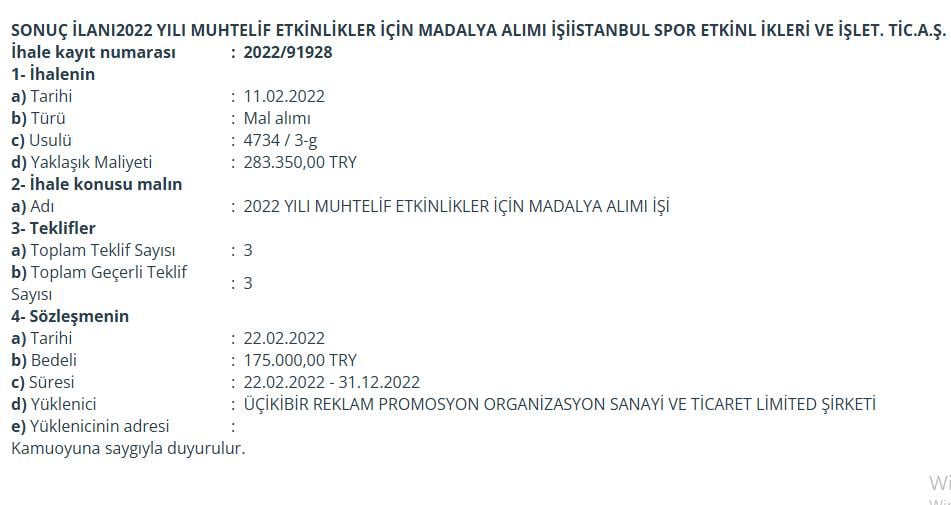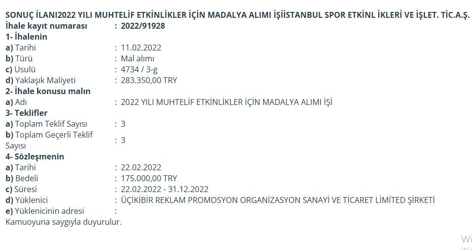 İlk ihalesini 11 Şubat 2022 tarihinde aldı. ‘Çeşitli spor etkinliklerinde kullanılmak üzere madalya alım işi’ başlıklı ihalenin sözleşme bedeli ise 175 bin TL oldu.