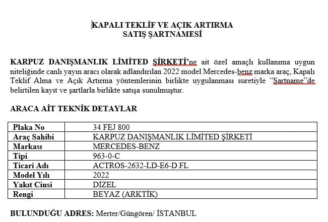 TMSF, şirketin mal varlıklarını değerlendirmeye devam ediyor. Motor yatın ardından İBB’nin etkinliklerinin canlı yayınlanmasını sağlayan 2022 model Mercedes-Benz marka canlı yayın aracı da satışa çıkarıldı. Araç 14 milyon 500 bin TL’den açık artırmaya sunulacak.