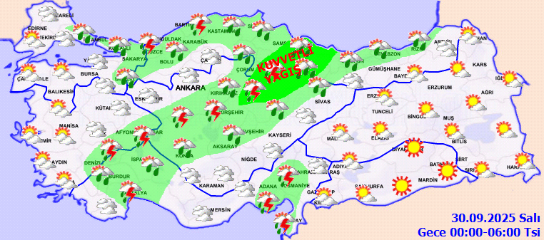 "Meteoroloji Genel Müdürlüğü'nden alınan son bilgilere göre; kuzeybatı kesimlerden itibaren yurdu etkilemeye başlayan sağanak yağışların; öğle saatlerinden sonra İç Ege (Kütahya, Afyonkarahisar, Uşak); akşam saatlerinden itibaren İç Anadolu'nun kuzeybatısı (Ankara, Eskişehir, Çankırı, Kırıkkale'nin kuzeyi) ve Orta Karadeniz'de (Samsun, Çorum ve Amasya) yerel kuvvetli olması bekleniyor. Vatandaşlarımızın ani sel, su baskını, yağış anında kuvvetli rüzgar ve ulaşımda aksamalar gibi olumsuzluklara karşı dikkatli ve tedbirli olmasını; yetkili mercilerin uyarılarını dikkate almalarını önemle hatırlatıyoruz"