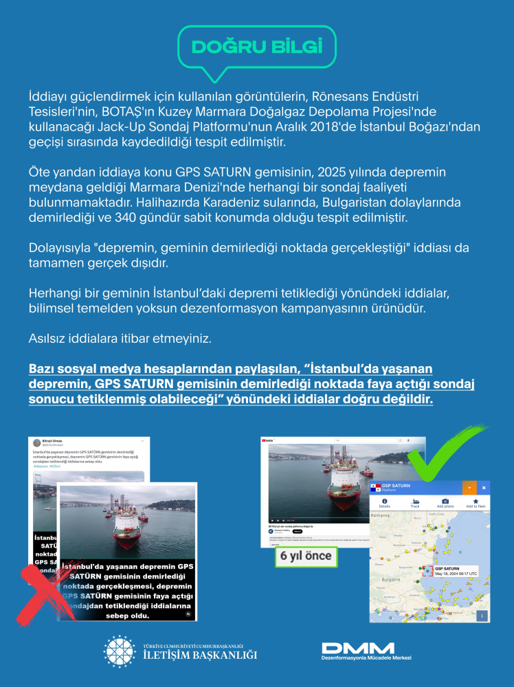 Cumhurbaşkanlığı İletişim Başkanlığı Dezenformasyonla Mücadele Merkezi (DMM), bazı sosyal medya hesaplarında yer alan "İstanbul'daki depremin, GPS SATURN gemisinin demirlediği noktada faya açtığı sondaj sonucu tetiklenmiş olabileceği" yönündeki asılsız iddialara yanıt verdi.