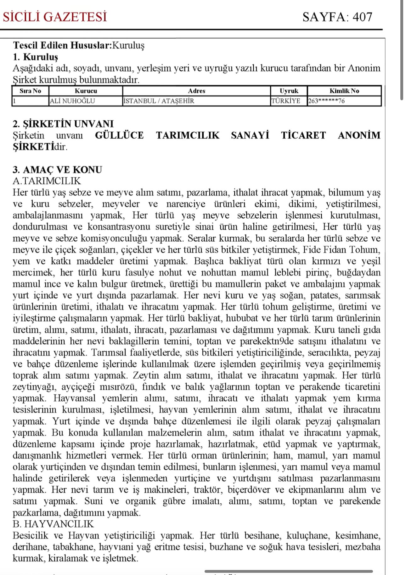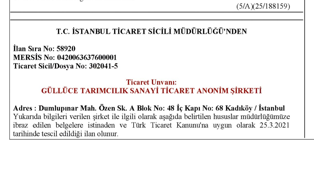 - Güllüce Tarım A.Ş., 2021 yılında Kadıköy’de kuruldu; yönetim kurulu başkanı Ali Nuhoğlu idi.