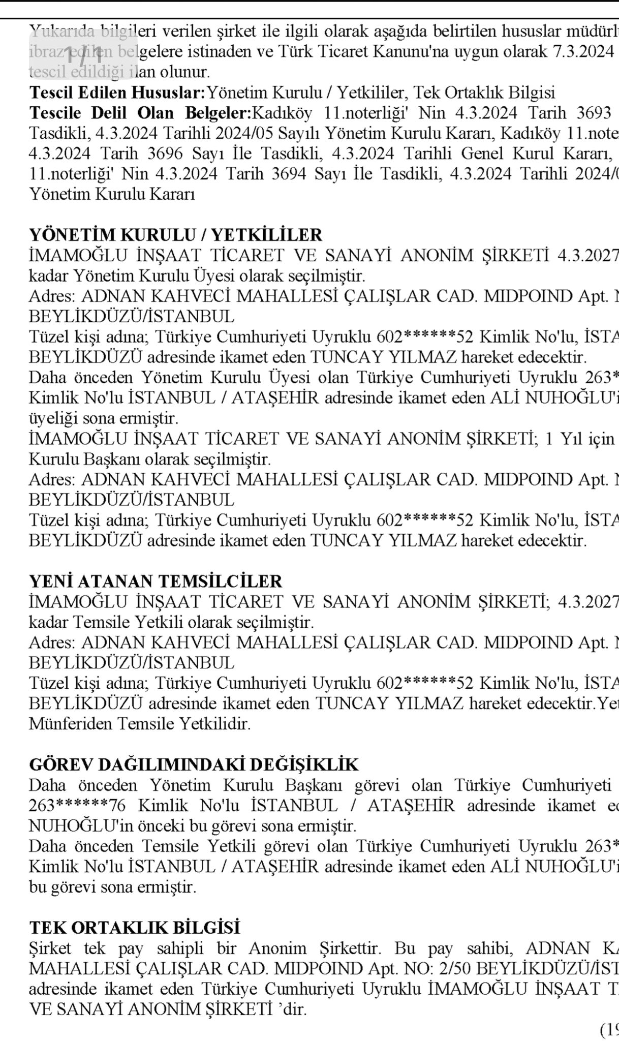 - 4 Mart 2024’te şirket, Beylikdüzü’ndeki İmamoğlu İnşaat’a devredildi.