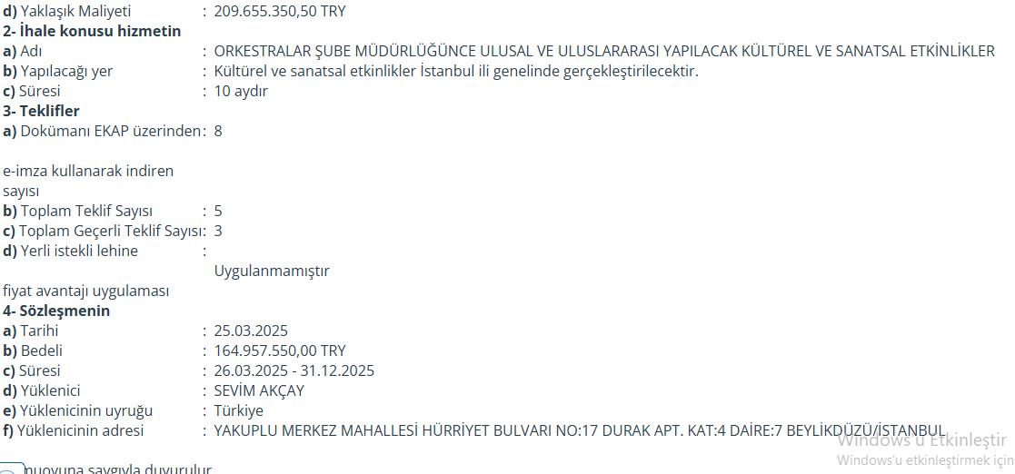 - İBB Orkestralar Şube Müdürlüğü, 25 Şubat 2025'te bir ihaleyi 164.9 milyon TL'ye Sevim Akçay'a verdi.