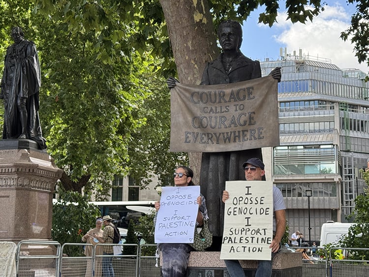 Eylemciler, yanlarında boş pankartlar ve kalemler getirerek, pankartlarına "Soykırıma karşıyım, Palestine Action'ı destekliyorum" ifadesini yazdı.