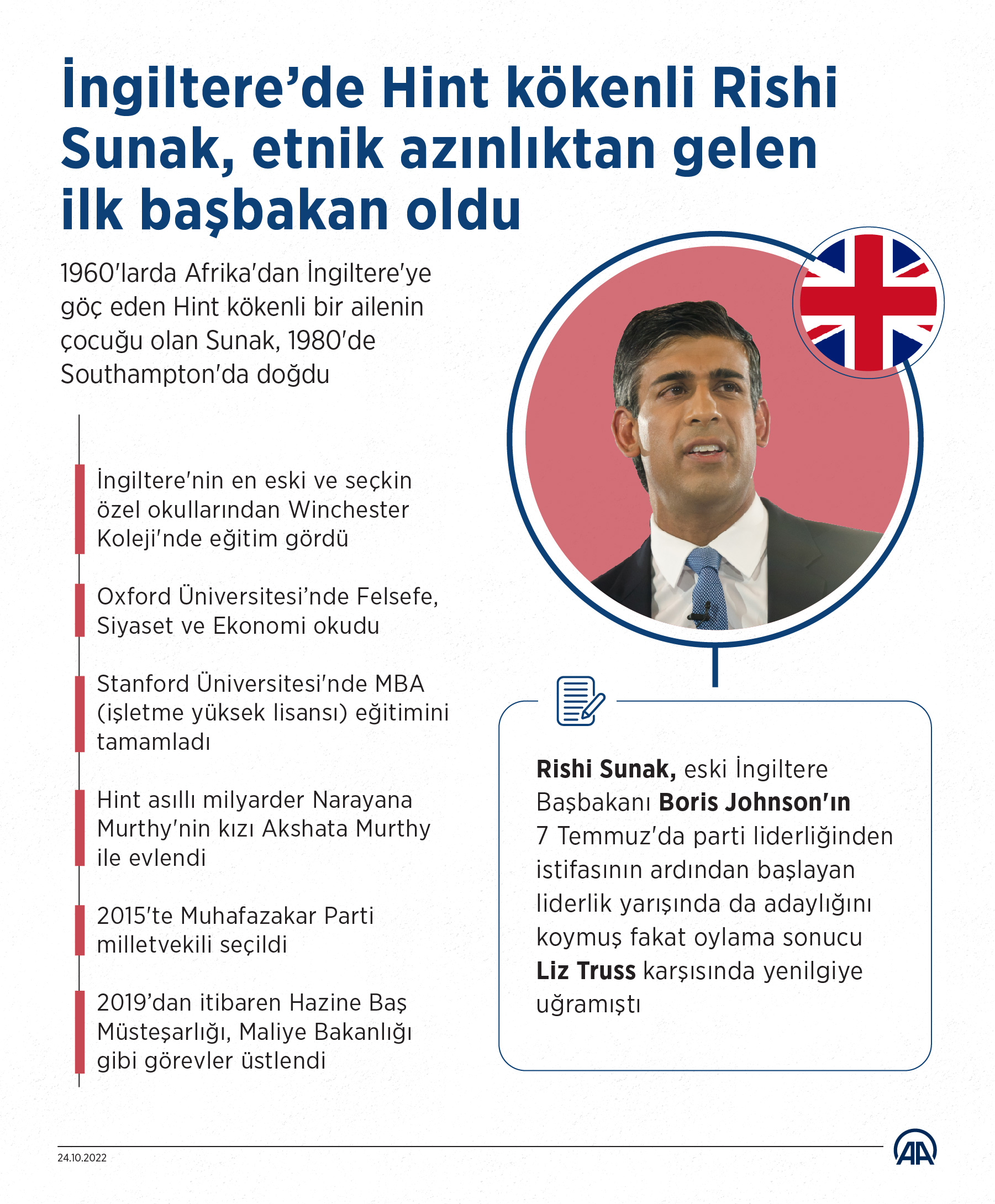 Hint asıllı Sunak, ülkenin etnik azınlıktan gelen ilk başbakanı olarak da tarihe geçti.