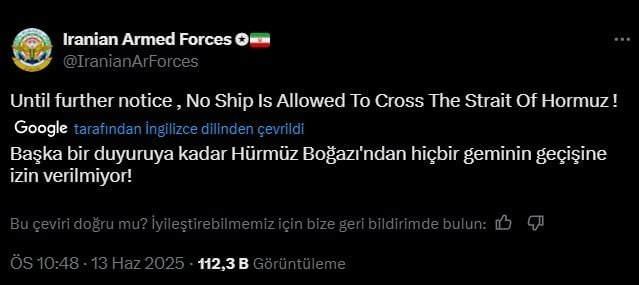 - İran İslam Cumhuriyeti Ordusu, Hürmüz Boğazı'nı ikinci bir duyuruya kadar kapattığını duyurdu.