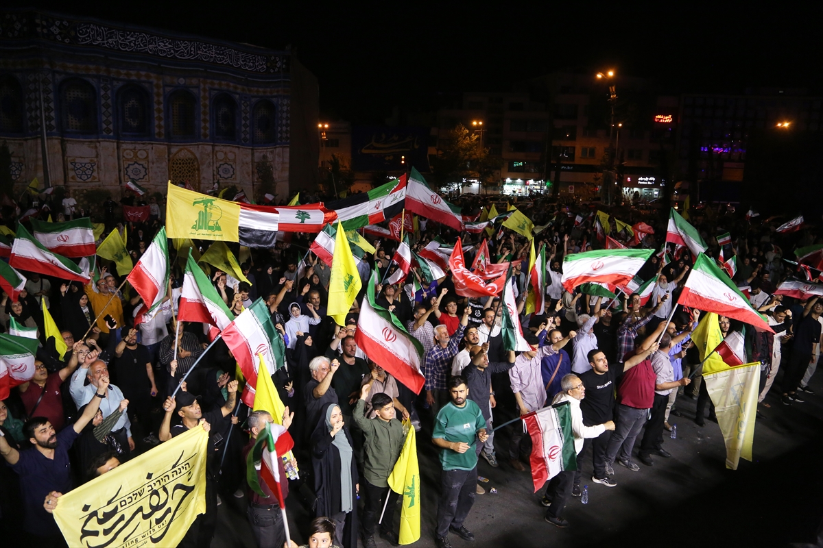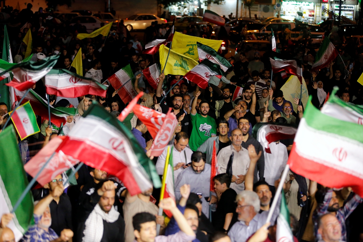 İran'ın İsrail'in saldırılarına karşılık yüzlerce balistik füzeyle karşı saldırıda bulunması sonrası, Başkent Tahran'ın İnkılap Meydanı'nda toplanan yüzlerce vatandaş, saldırıları meydanda kurulan dev ekranda izleyerek sevinç gösterilerinde bulundu.