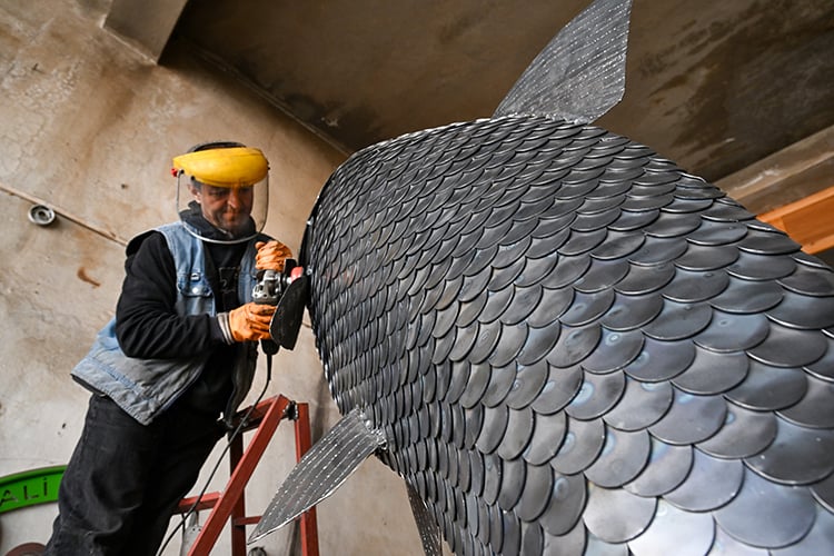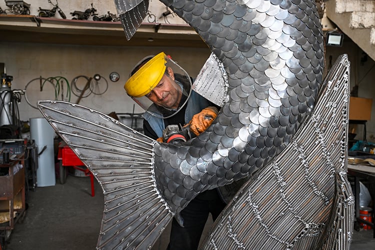 - Heykelin yüzeyini balığa benzetmek için hurda sacdan yaklaşık 3 bin pul yaparak kaynakla birleştiren Mutii, eseri 2,5 ayda tamamladı.