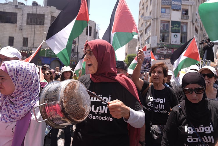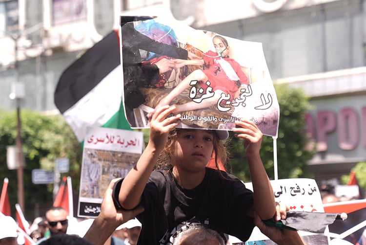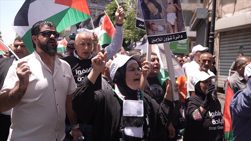 Binlerce Filistinlinin katıldığı eylemlerde İsrail'in Gazze'de sürdürdüğü soykırıma ve açlığa dikkati çeken pankartlar taşındı, uluslararası toplumun sessizliğini kınayan sloganlar atıldı.