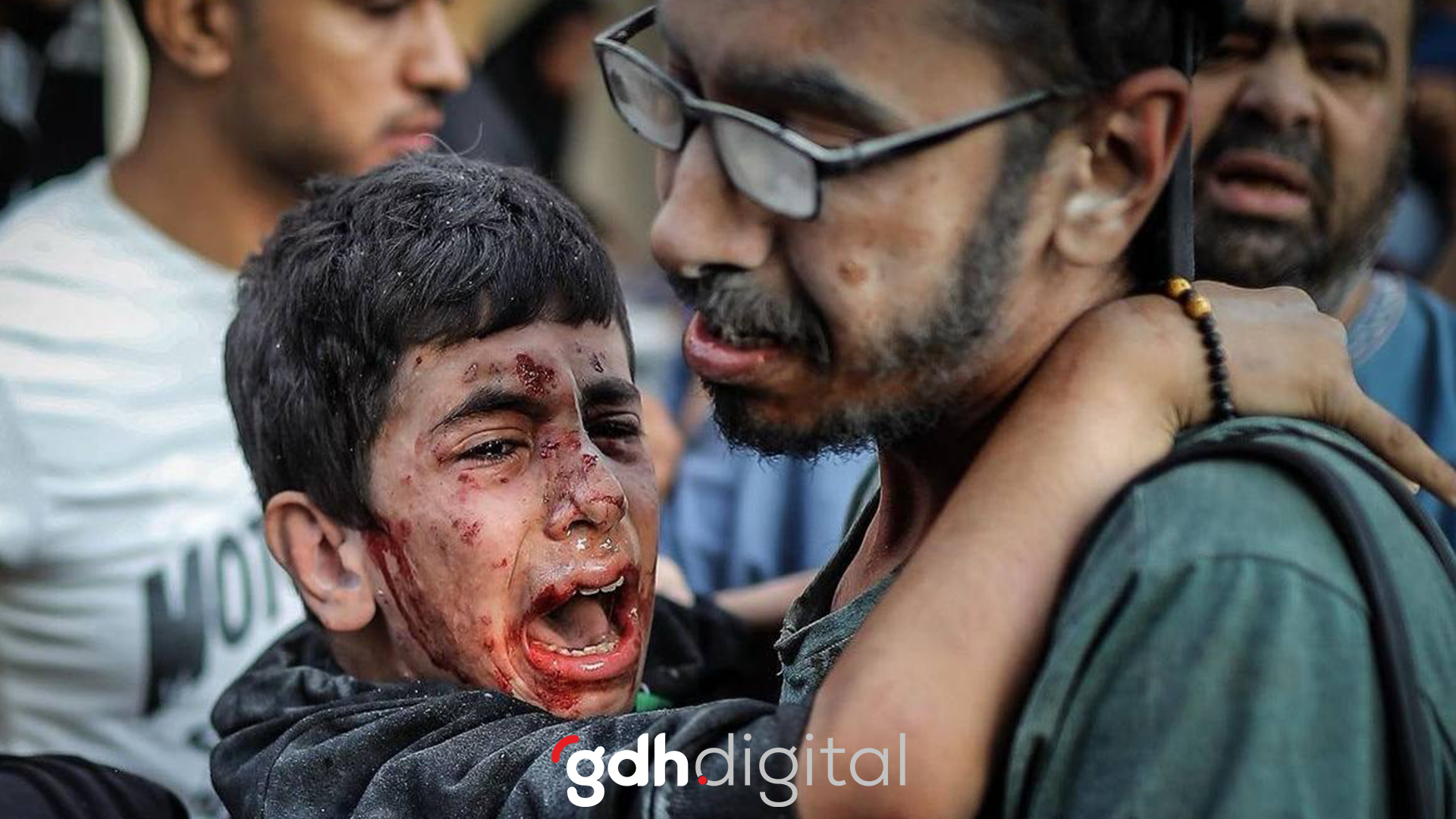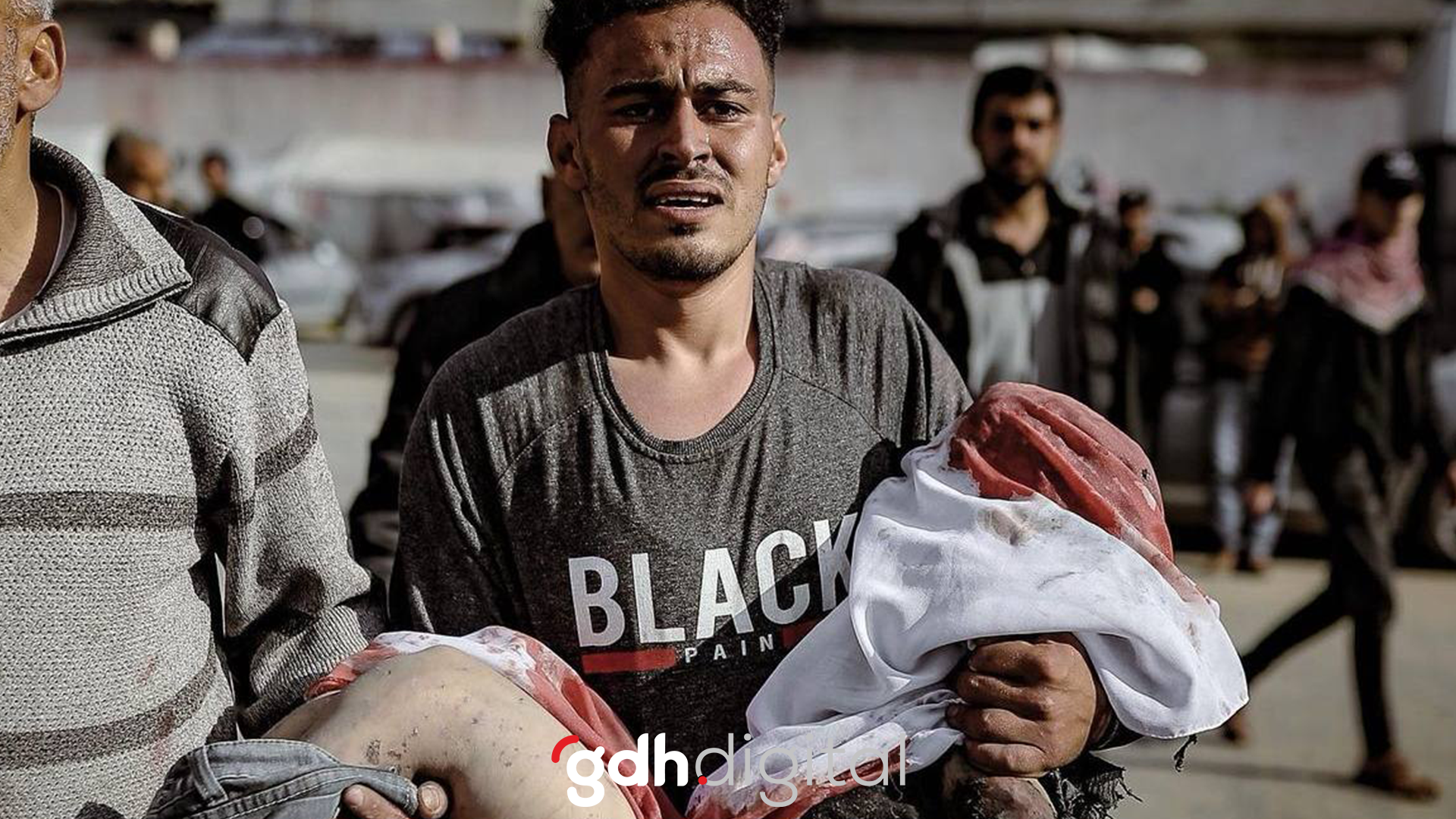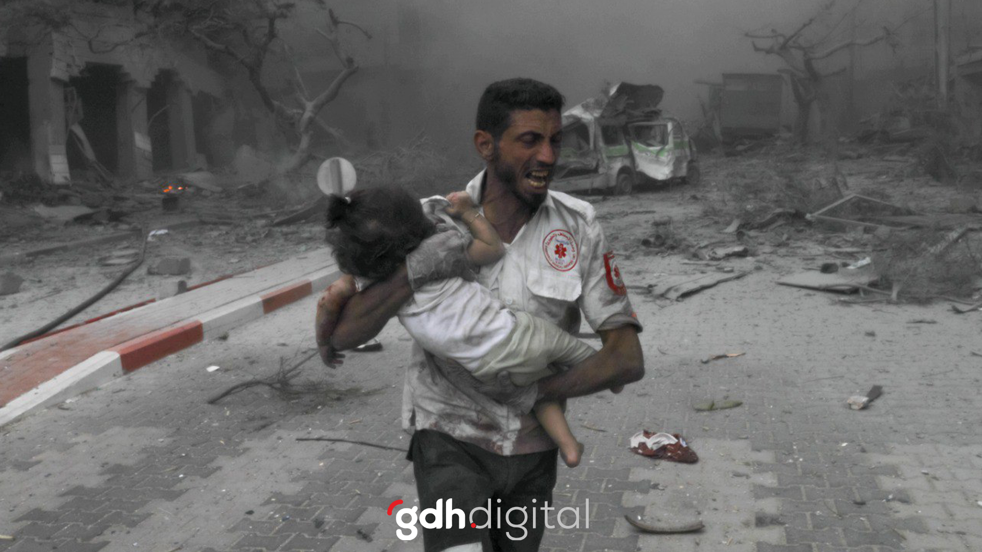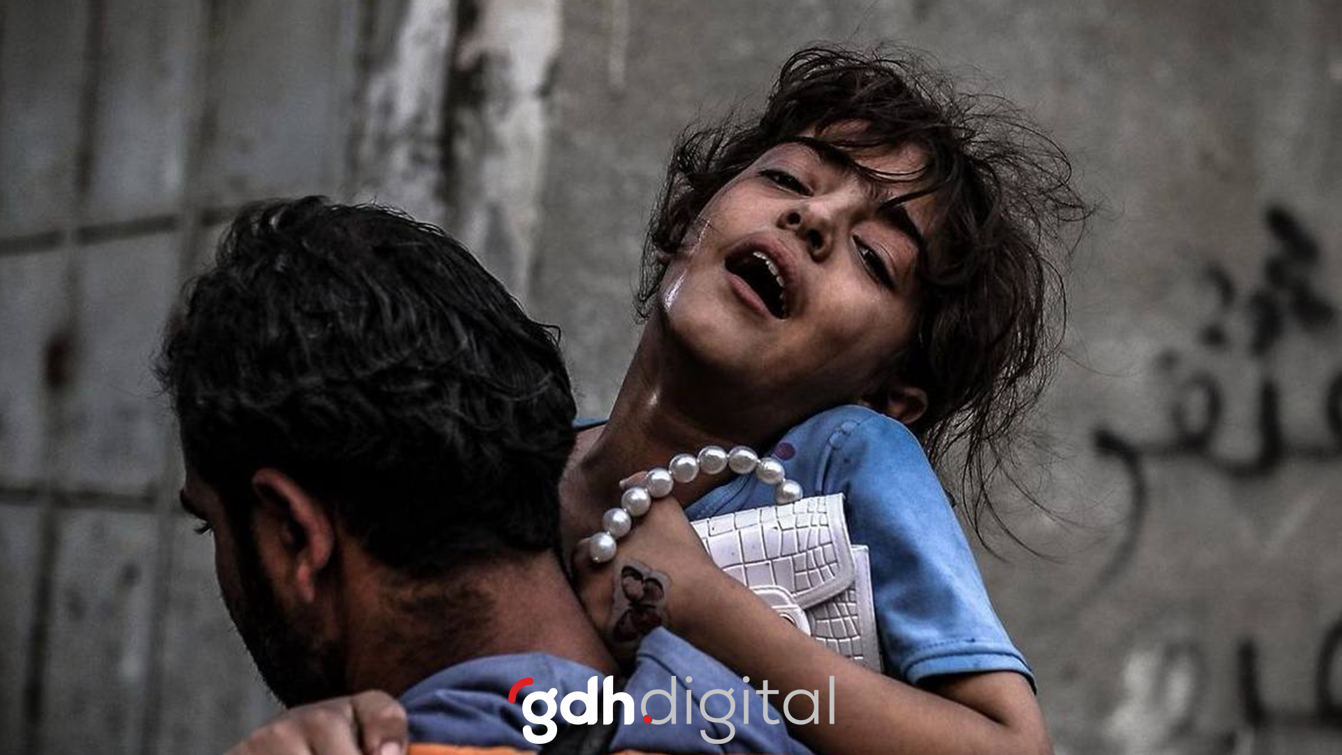 Yaralı bir baba, kendi yaralarına aldırmadan, çocuğunu hastaneye yetiştirmeye çalışıyor. Gazze'de her gün benzer acılar yaşanıyor.