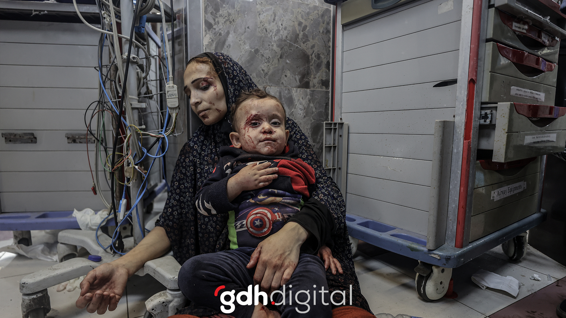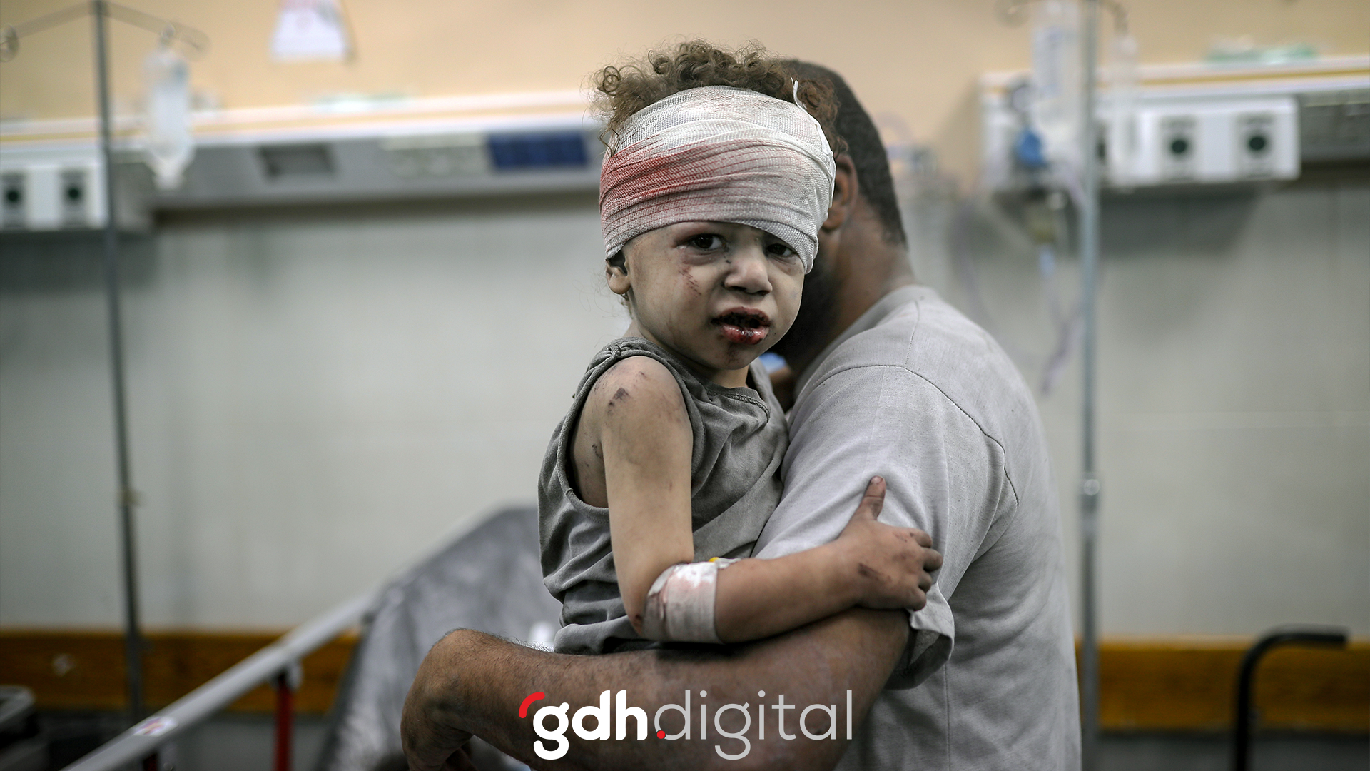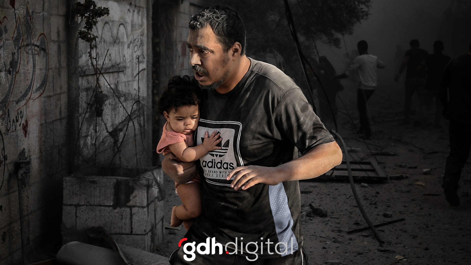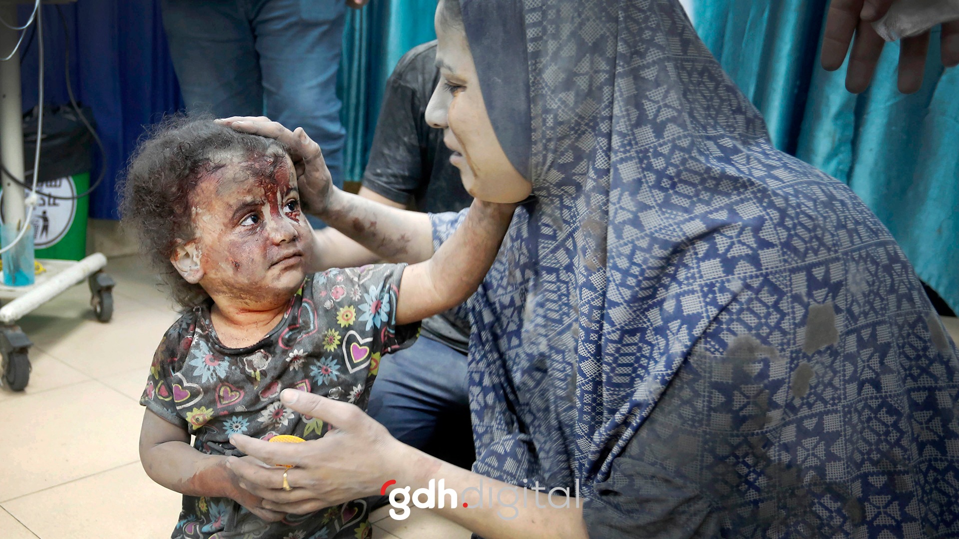 Yaralı bir baba, kendi yaralarına aldırmadan, çocuğunu hastaneye yetiştirmeye çalışıyor. Gazze'de her gün benzer acılar yaşanıyor.