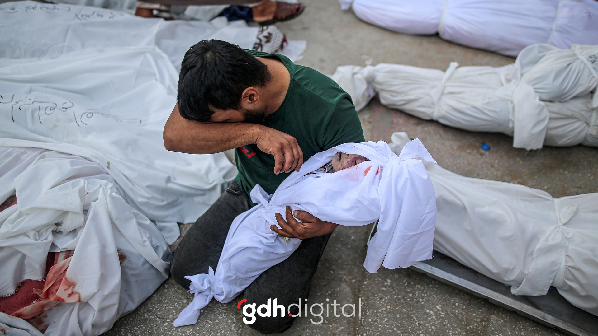 İsrail'in saldırılarında evladını kaybeden baba, onlarca cesedin arasında acı içerisinde ağlıyor.