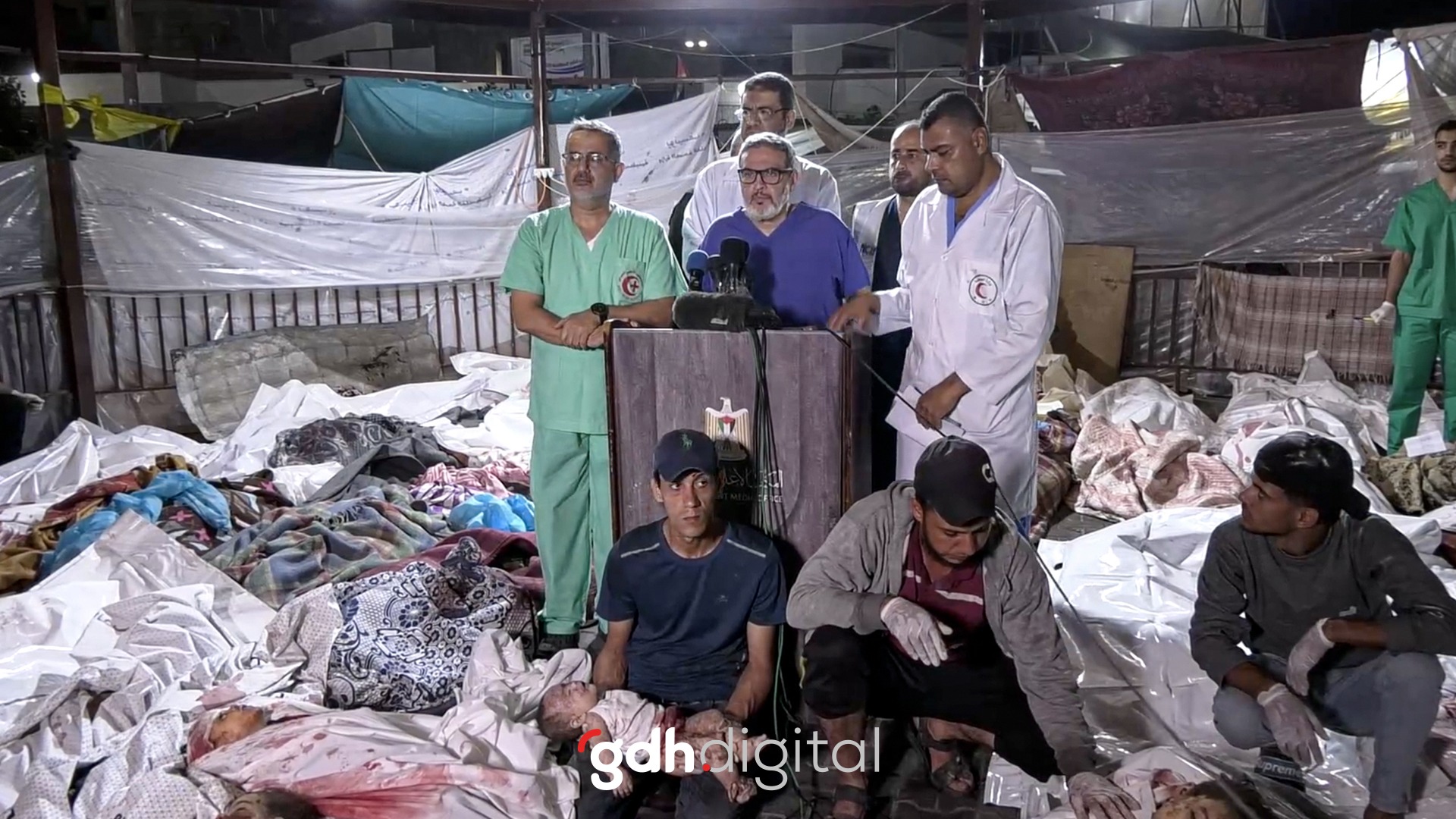 İsrail'in Gazze'de bombaladığı ilk hastane olan El Ehli Baptist Hastanesi'nin doktorlarının onlarca ceset arasında basın toplantısı düzenleyerek zulmü duyurmak için dünyaya seslendiği karanlık anlar.