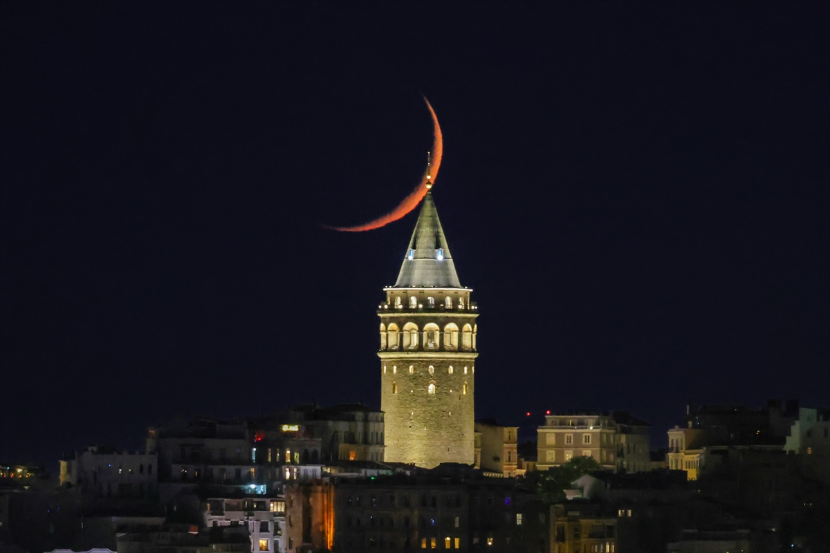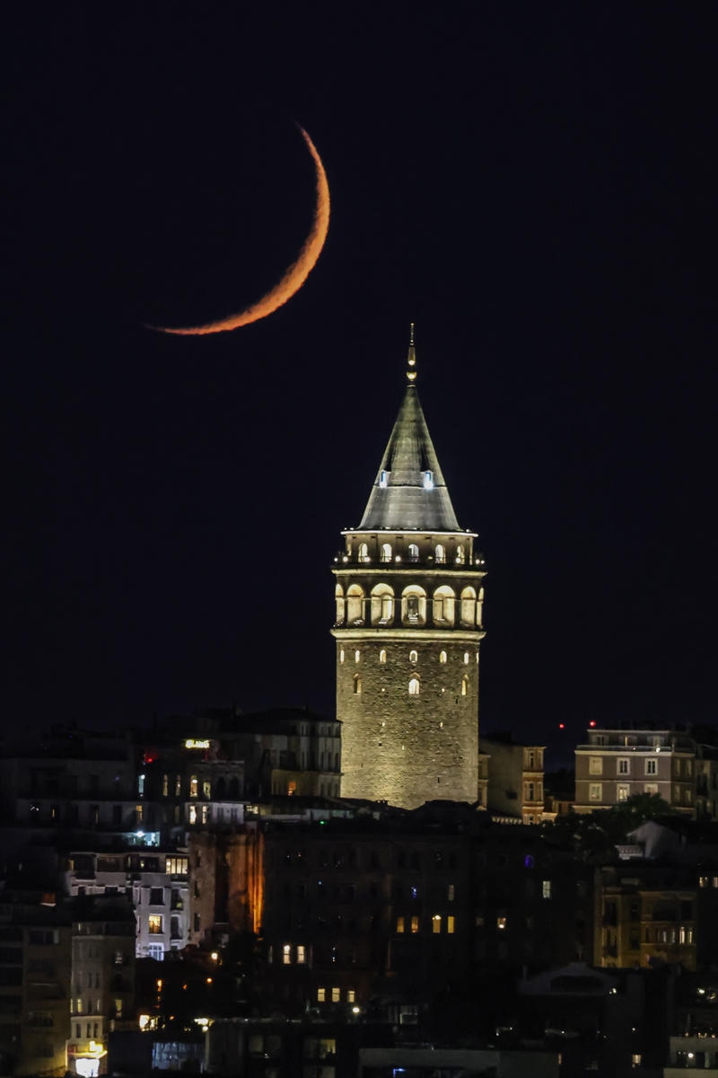 İstanbul'da Galata Kulesi ile hilalin görüntüsü kartpostallık sahneler oluşturdu.