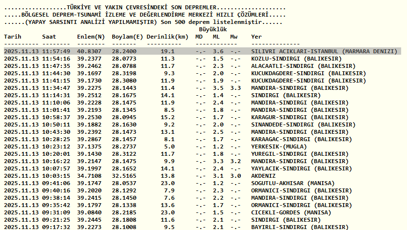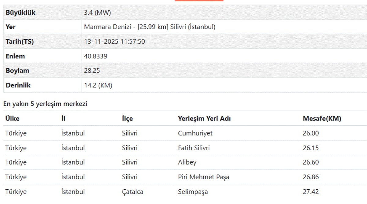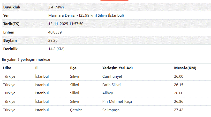 13 Kasım AFAD ve Kandilli Rasathanesi verileriyle İstanbul deprem bilgileri şöyle;
