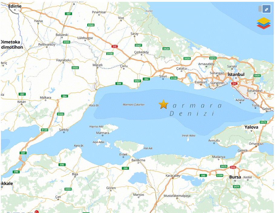 Marmara Denizi İstanbul Silivri açıklarında meydana gelen depremin merkez üssü yıldız işaretinin yer aldığı nokta olarak açıklandı.
