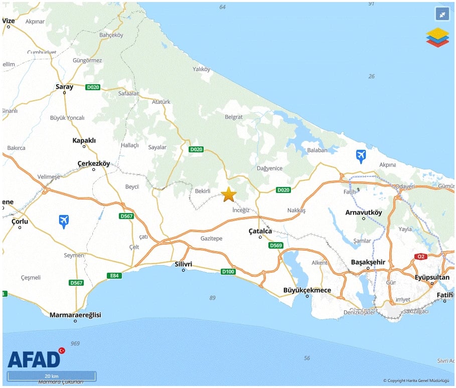 AFAD son depremler listesine göre ise İstanbul Çatalca'da meydana gelen deprem yerin 2.6 KM derinliğinde 2.6 şiddetinde olarak ölçüldü.