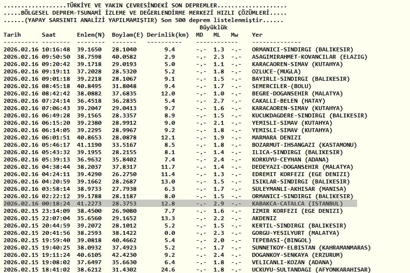 16 Şubat AFAD ve Kandilli Rasathanesi son depremler listesi verileri şöyle;