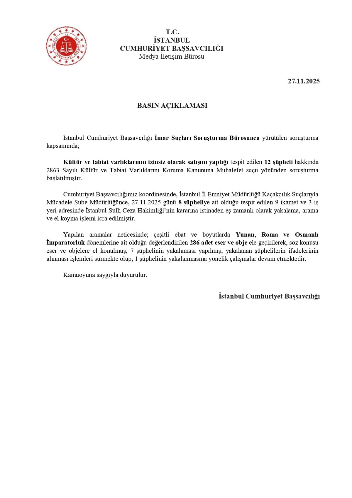 İstanbul Cumhuriyet Başsavcılığı İmar Suçları Soruşturma Bürosu tarafından yürütülen soruşturmada, kültür ve tabiat varlıklarını izinsiz sattığı tespit edilen 12 şüpheli hakkında 2863 Sayılı Kültür ve Tabiat Varlıklarını Koruma Kanunu’na muhalefet suçundan soruşturma başlatıldı.