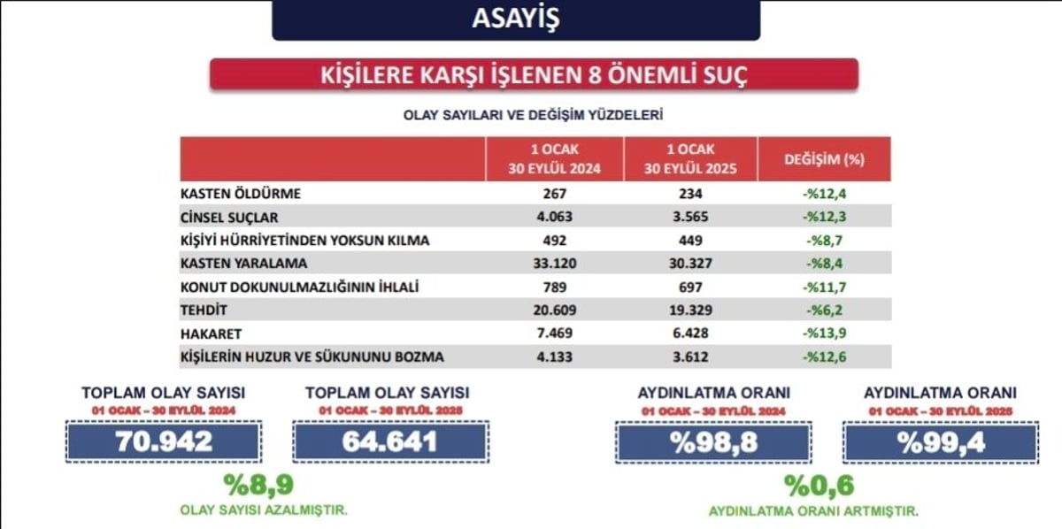 - Kişilere karşı işlenen suçlar geçen yıla göre yüzde 9 azalırken, aydınlatma oranı yüzde 99,4 gibi yüksek bir seviyeye ulaştı.