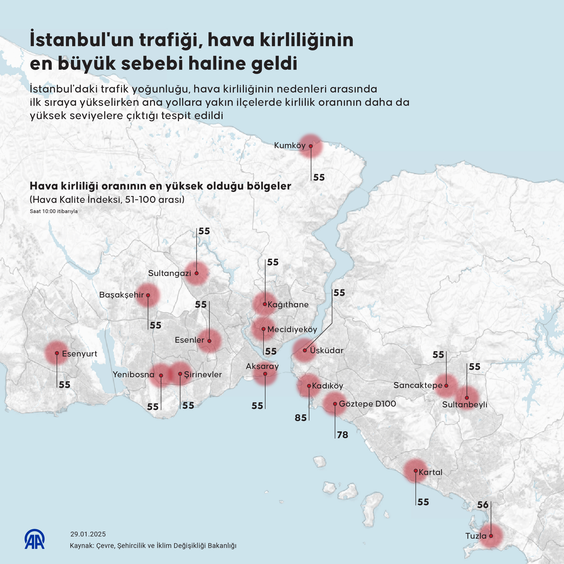 "Kağıthane 1 (Kentsel Trafik)-102 (Hassas-Turuncu), D100 (Trafik)-92 (Orta-Sarı), Kadıköy (Kentsel)-85 (Orta-Sarı), Tuzla (Kentsel)-63 (Orta-Sarı), Mecidiyeköy (Trafik)-57 (Orta-Sarı), Aksaray (Trafik)-52 (Orta-Sarı), Şirinevler (Trafik)-52 (Orta-Sarı), Sancaktepe (Kentsel)-50 (İyi-Yeşil), Kartal (Kentsel)-49 (İyi-Yeşil), Sulgangazi 3 (Taş ocakları)-48 (İyi-Yeşil), Kumköy (Arka plan)-48 (İyi-Yeşil), Sultangazi 4 (Kentsel trafik)-47 (İyi-Yeşil), Esenler (Kentsel)-47 (İyi-Yeşil), Üsküdar 2 (Trafik)-46 (İyi-Yeşil), Esenyurt (Kentsel)-44 (İyi-Yeşil), Yenibosna (Kentsel)-44 (İyi-Yeşil), Üsküdar 1 (Kentsel trafik)-43 (İyi-Yeşil), Başakşehir (Sanayi kentsel)-42 (İyi-Yeşil), Alibeyköy (Kentsel)-41 (İyi-Yeşil), Sultanbeyli (Kentsel)-38 (İyi-Yeşil), Kandilli 2 (Deniz trafik)-37 (İyi-Yeşil), Sultangazi 2 (Kentsel trafik)-35 (İyi-Yeşil), Bağcılar (Kentsel)-35 (İyi-Yeşil), Kağıthane 2 (Kentsel)-35 (İyi-Yeşil), Beşiktaş (Trafik)-33 (İyi-Yeşil), Ümraniye 2 (Trafik)-32 (İyi-Yeşil), Ümraniye 1 (Şehir arka plan)-32 (İyi-Yeşil), Silivri-32 (İyi-Yeşil), Selimiye (Trafik)-30 (İyi-Yeşil), Maslak (Şehir arka plan)-30 (İyi-Yeşil), Kandilli 1 (Şehir arka plan)-29 (İyi-Yeşil), Avcılar (Şehir arka plan)-27 (İyi-Yeşil), Sarıyer (Kentsel)-27 (İyi-Yeşil), Arnavutköy (Kırsal)-26 (İyi-Yeşil), Çatladıkapı (Trafik)-22 (İyi-Yeşil), Şile (Arka plan)-21 (İyi-Yeşil), Büyükada (Arka plan)-17 (İyi-Yeşil), Beylikdüzü (Kentsel)-15 (İyi-Yeşil), Sultangazi 1 (Taş ocakları)-12 (İyi-Yeşil)."