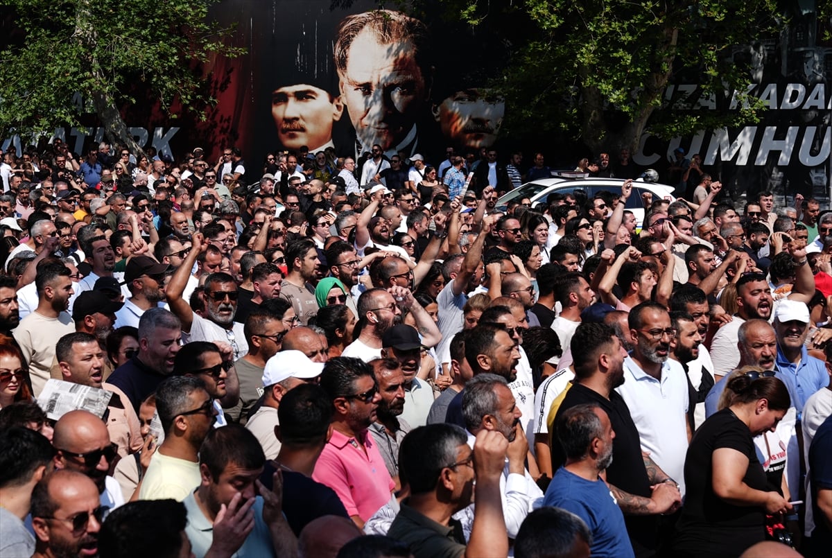 Kültürpark'taki İzmir Büyükşehir Belediyesi hizmet binası önünde toplanan işçiler, sloganlar attı.
