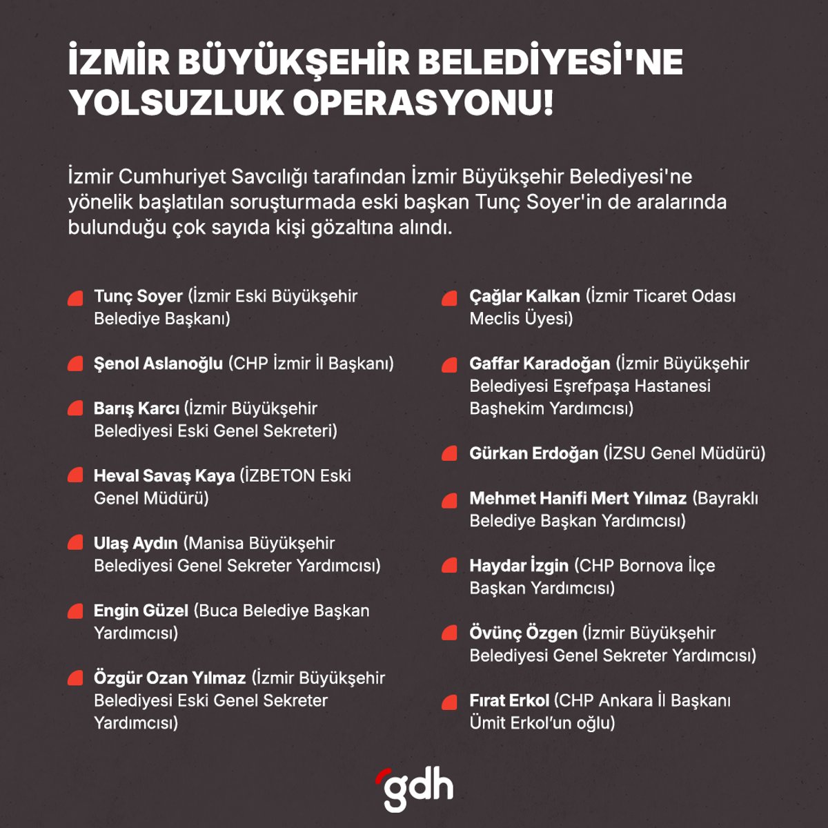 - Gözaltı kararı verilenler arasında İzmir Büyükşehir Belediyesi'nin eski ve mevcut yöneticileri ile bazı parti yetkilileri bulunuyor.