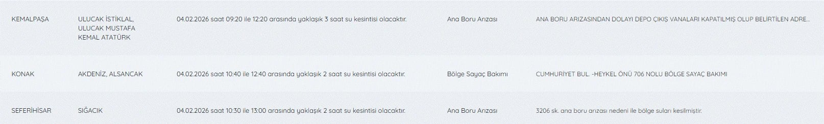 İZSU su kesintileri listesi 4 Şubat günü İzmir su kesintileri hakkında bilgi sahibi olmak isteyenlerce 4 Şubat İzmir'de su kesintisi var mı, nerelerde, ne zaman düzelir? sorularıyla yapılan araştırmalarla öğrenilmek isteniyor.