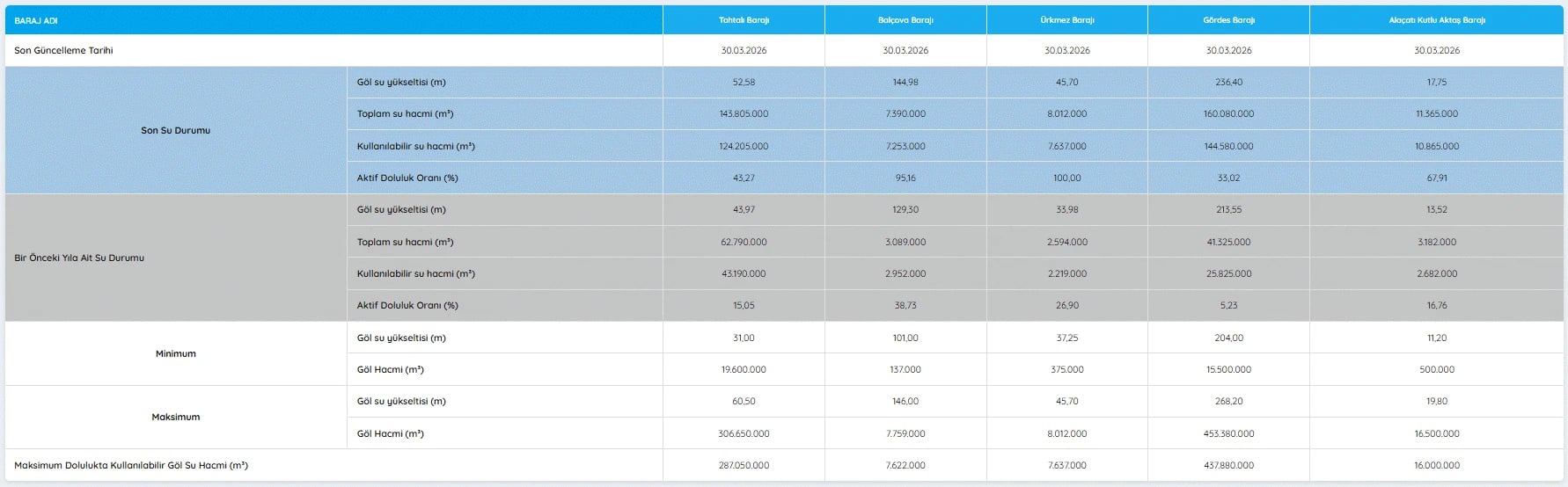 İZMİR BARAJ DOLULUK ORANLARI 30 MART