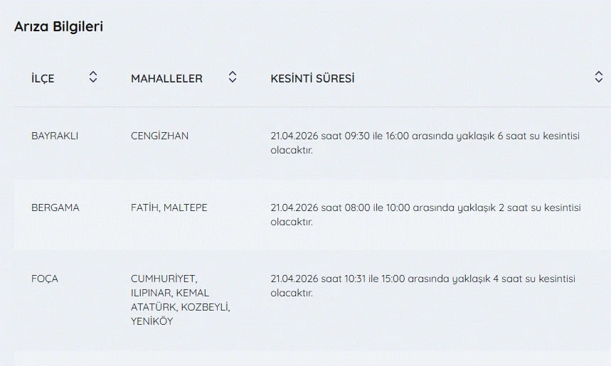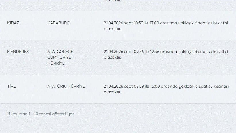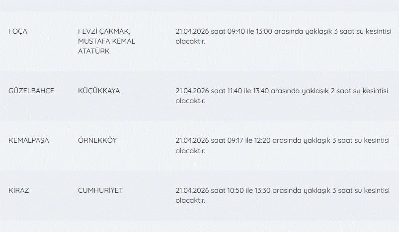 İzmir'de 21 Nisan günü yapılacak olan planlı ve arıza kaynaklı su kesintilerine ilişkin bilgi sahibi olmak isteyenler yoğun olarak bugün İzmir'de su kesintisi var mı, nerelerde, ne zaman düzelir? soruları üzerinden araştırmalarını sürdürüyor.