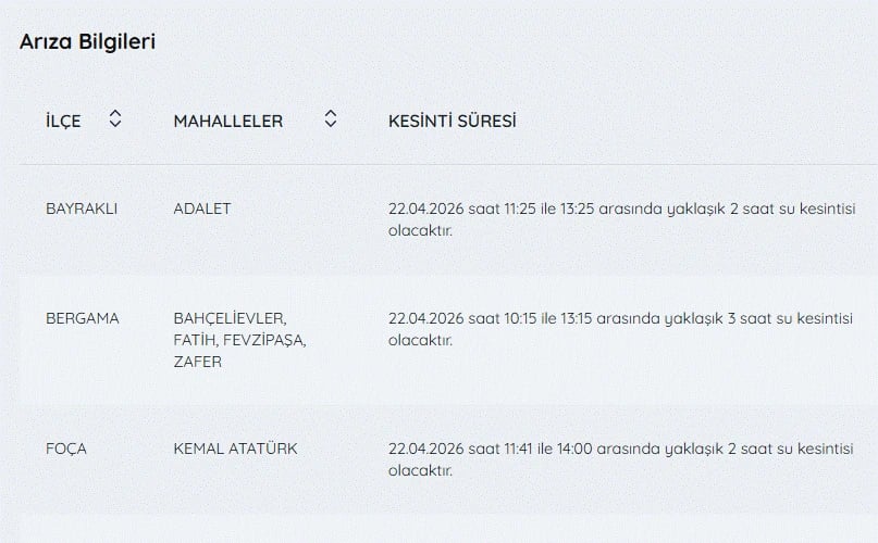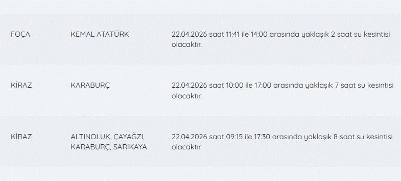 İZSU KESİNTİLER LİSTESİ 22 NİSAN 2026