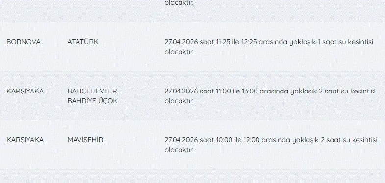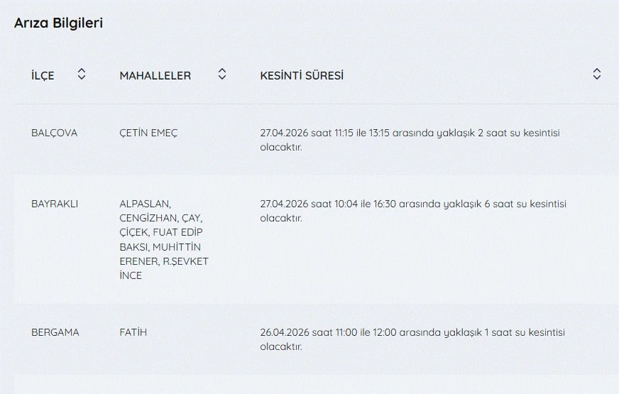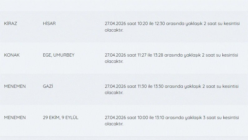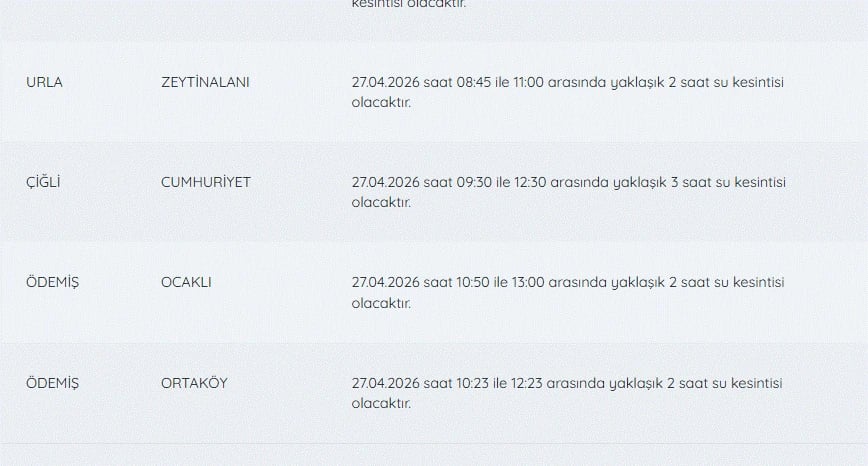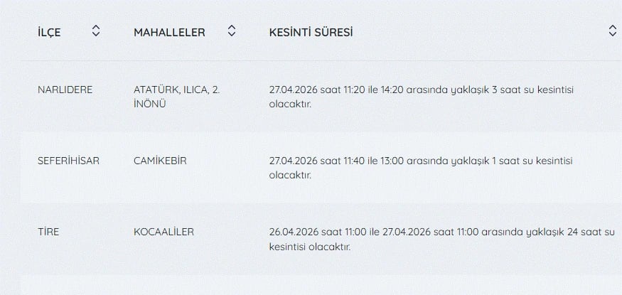 İZSU kesintiler listesi 27 Nisan günü İzmir'de yapılacak su kesintilerini öğrenmek isteyenler tarafından 27 Nisan İzmir'de su kesintisi var mı, nerelerde, kaç şiddetinde? soruları üzerinden yoğun olarak araştırılıyor.