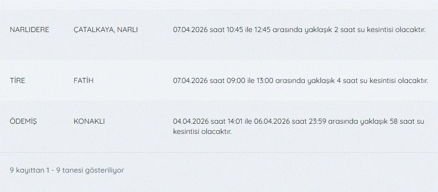İZSU KESİNTİLER LİSTESİ 7 NİSAN