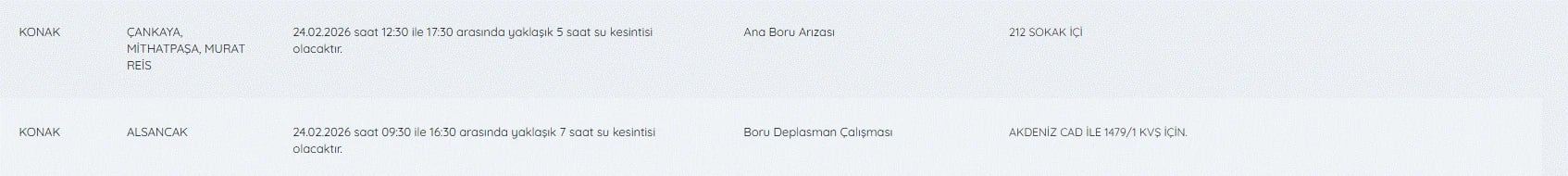 İZSU KESİNTİLER LİSTESİ 24 ŞUBAT