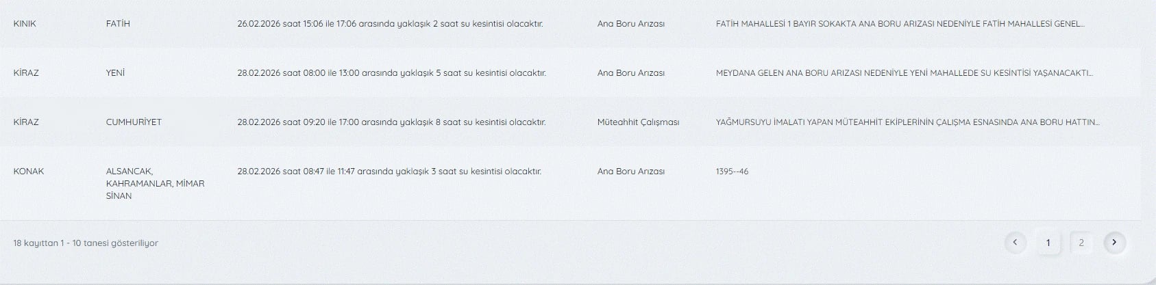 İZSU KESİNTİLERİ LİSTESİ