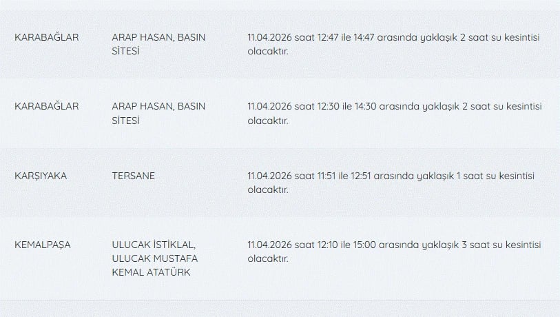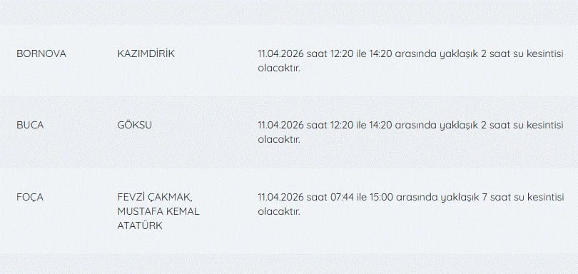 İzmir su kesintileri listesi 11 Nisan günü ilde kesinti yapılacak ilçeleri öğrenmek ve tedbir almak isteyenler tarafından yoğun olarak İZSU ile 11 Nisan bugün İzmir'de su kesintisi var mı, nerelerde, ne zaman düzelecek? sorularına yanıt aranıyor.
