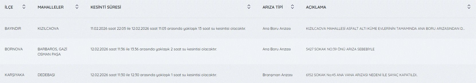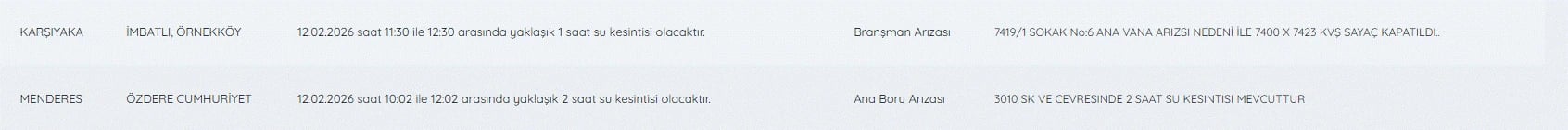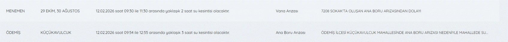12 Şubat İzmir su kesintileri listesi ve detayları şöyle;