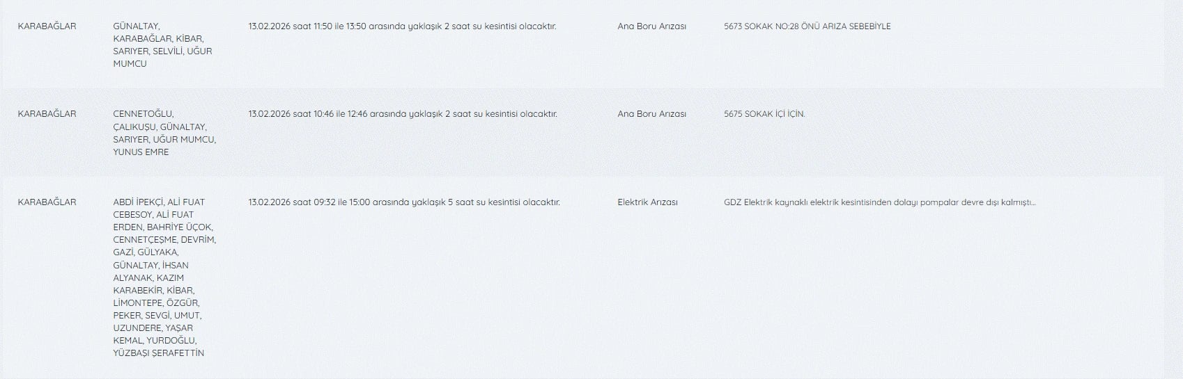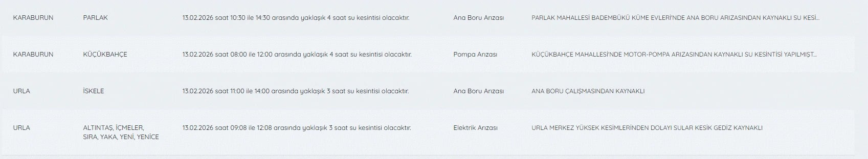 İzmir su kesintileri listesi 13 Şubat günü ilde yaşayanlar tarafından yakından takip edilerek söz konusu kesintileri önceden öğrenmek ve tedbir almak isteyenler İZSU su kesintileri listesine erişmek isteyerek bugün İzmir'de su kesintisi var mı, nerelerde, sular ne zaman gelecek?
