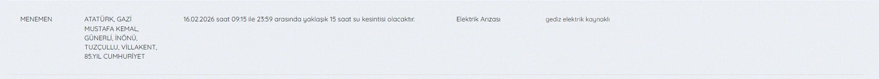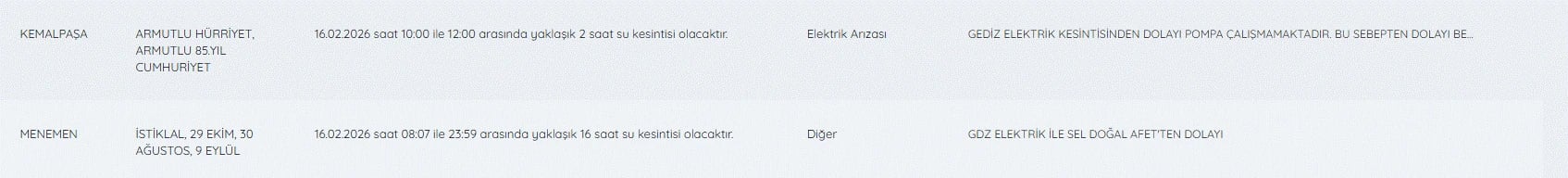 16 Şubat İzmir su kesintileri listesi ve tüm detaylar şöyle;