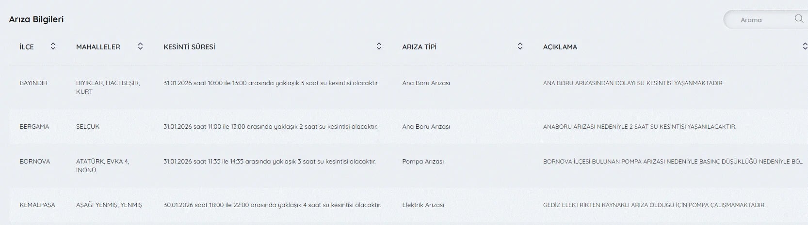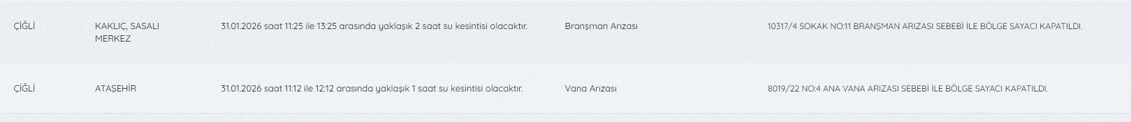 İZSU su kesintileri listesi, 31 Ocak günü İzmir su kesintileri listesine erişmek isteyenler tarafından 31 Ocak İzmir'de su kesintisi var mı, nerelerde, ne zaman düzelecek? soruları üzerinden araştırılıyor.