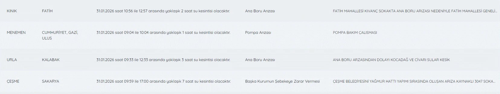 İZSU su kesintileri listesi | 31 Ocak İzmir'de su kesintisi var mı, nerelerde, ne zaman düzelecek?