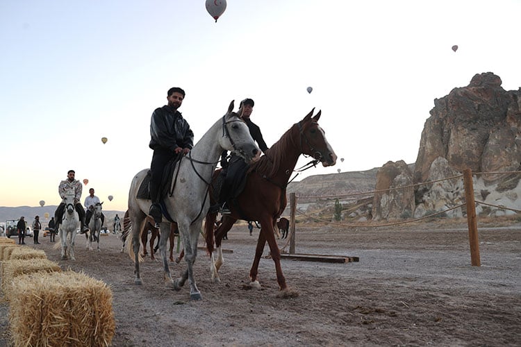 Nevşehir'in Göreme beldesinin ev sahipliği yaptığı festivalde biniciler, sıcak hava balonlarının kalkış alanında, gün doğumu vaktinde atlı tur düzenledi.
